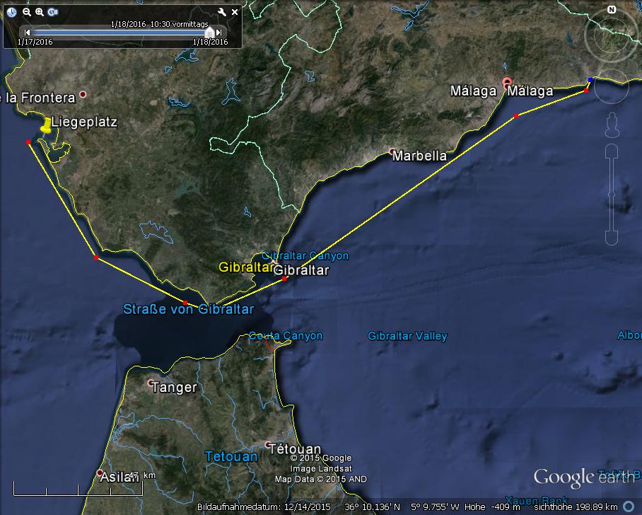 von Gibraltar, Kursänderung auf 58°, Autopilot an, noch etwa 70 NM bis Velez-Malaga, voraussichtlich