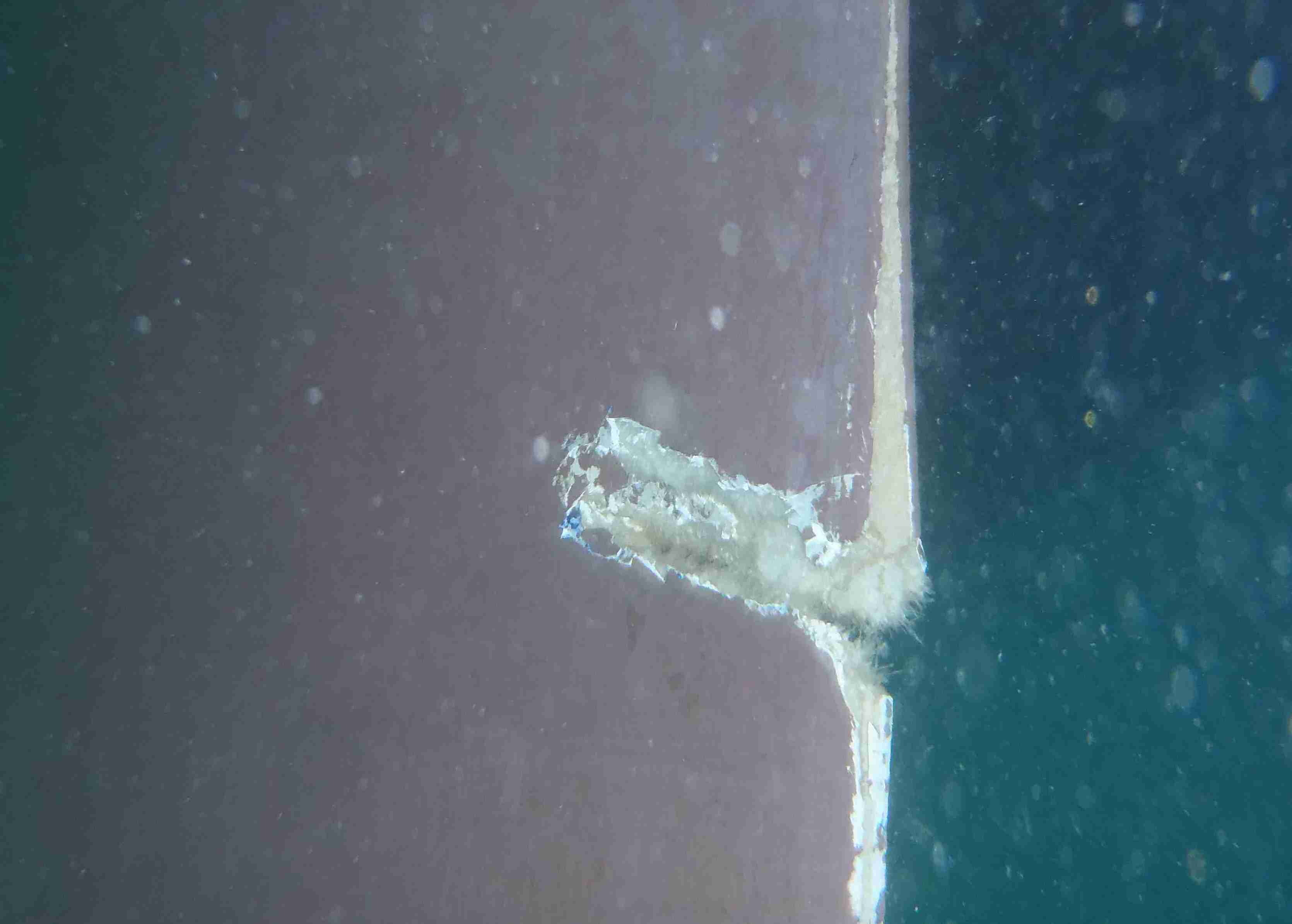 ich bin runtergetaucht und habs mir genau angesehen. auf der rechten seite ist das GFK gnach aussen esplittert, es schaut schon so aus, dass von links was scharfkantiges eingedrungen ist.