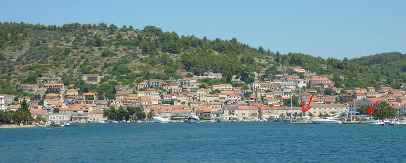 @ Jobe: Ich hab noch ein Foto für dich gefunden (zum Vergrößern bitte anklicken), wo wir nach Vela Luka fotografiert haben. Der linke Pfeil ist die Mole zum Anlegen mit Wasser und Strom, der rechte Pfeil die Tankstelle - aber ohne Wasser und ganz lonks siehst du die Abgrenzung des Schwimmbereichs des Hotels. Wie gesagt 2sm und du bist in einer wunderschönen Bucht.