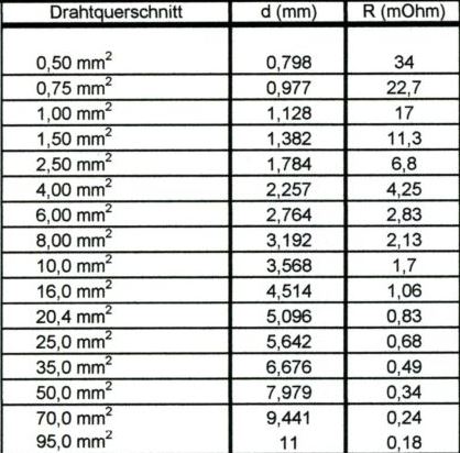 Hier noch eine Liste für Kupfer Querschnitt, Durchmesser, Wiederstand pro Meter