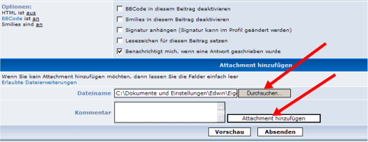 Beim Avatar funktioniert es so ähnlich - einfach im Profil (ganz unten) die Datei von Deiner Festplatte auswählen und zum Abschließen auf Absenden klicken! Zu achten ist lediglich auf die Dateigröße! (bei Fotos in Beiträgen: max. 256 KB und bei Avataren max. 8 KB)
