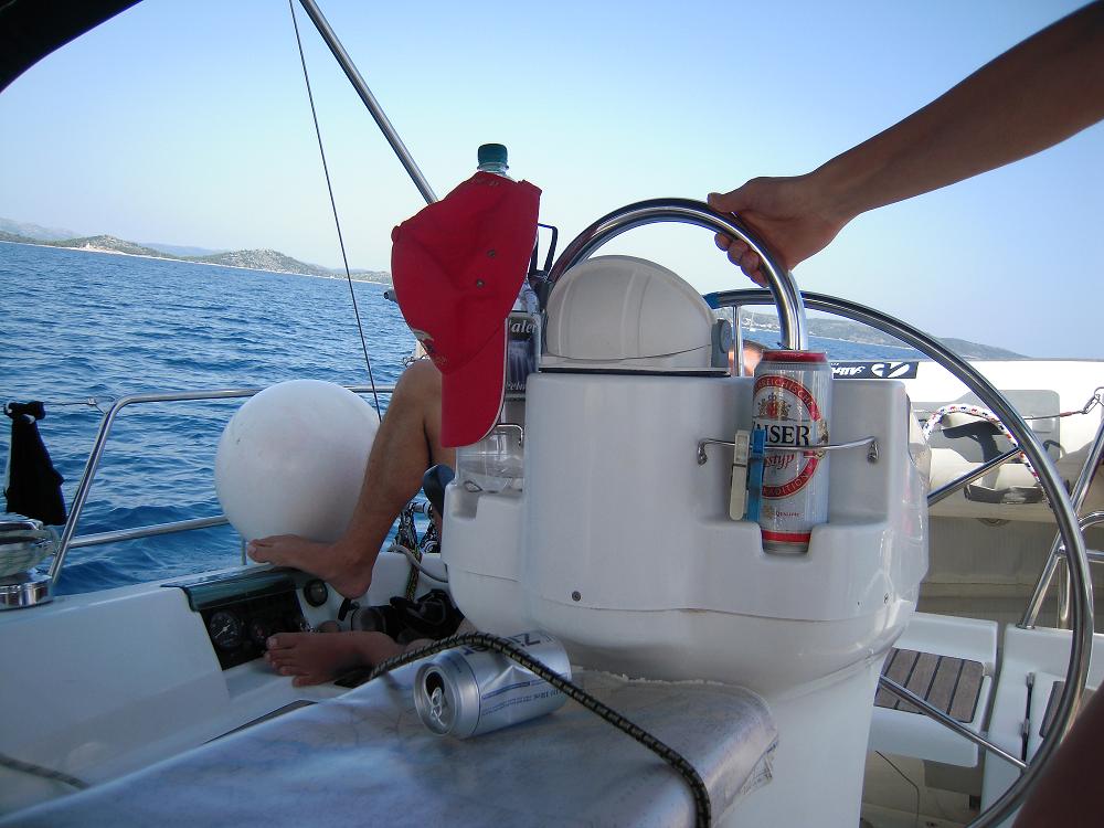 ich habe seit jahren die karten im plastik auf dem plichttisch mit expander festgemacht. sie kann dann bei krängung nicht runterrutschen und auch nicht nass werden (bei 11 bft bröseltrocken :mrgreen: ). sie kommt dort vorm auslaufen hin und verschwindet erst am abend wieder unter deck (ausser beim mittagessen). ich brauche nur meinen blick senken und sehe sofort auf die karte. daher weiß ich grundsätzlich immer, bei welcher insel ich gerade vorbeifahre. natürlich kann es z.b. bei den 100 kornateninsel schon mal vorkommen, dass man nicht exakt weiß: "ist es diese einfahrt oder die nächste?", dann gehe ich hinunter und blicke auf den plotter, der immer mitläuft.