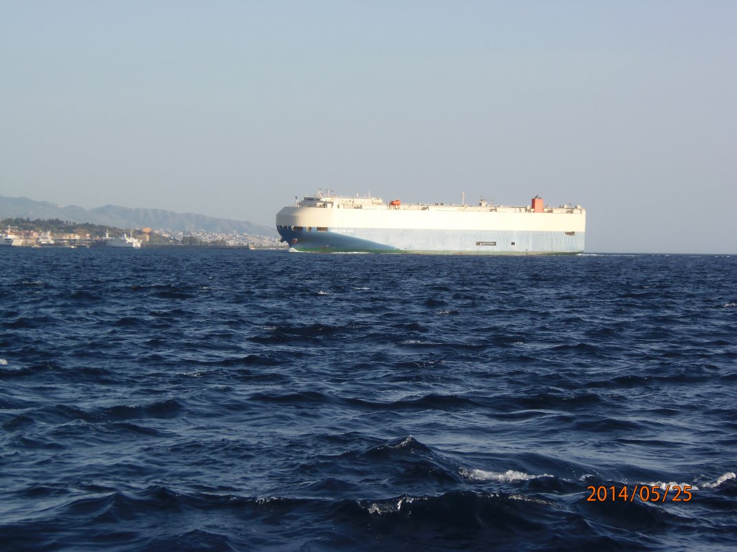 Er läuft Steuerbord an uns vorbei, wendet 2 NM hinter uns, überholt uns nochmal und fährt dann die Straße von Messina nach Süden.