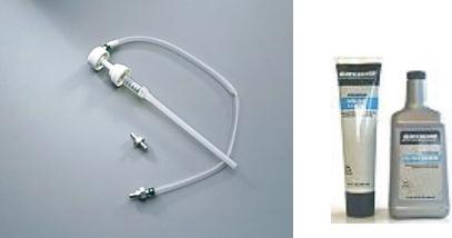 Die Tuben mit dem Marinegetriebeöl haben vorne bei der Tubenöffnung eine spitze Tülle die du in die untere Öffnung steckst, durch die konische Spitze wird die Schraubenöffnung beim füllen abgedichtet. Dann drückst du die Tube zusammen und füllst bis oben bei der Kontrollöffnung Öl austritt. Die Tuben haben eine Kapazität von ca. 0,3lt also brauchst du zwei Tuben da dein Getriebe 0,43lt fasst.