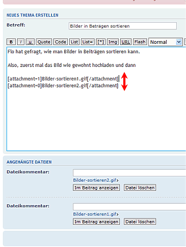 Also, zuerst mal das Bild wie gewohnt hochladen und dann auf den Button "Im Beitrag anzeigen" klicken (siehe Screenshot 2). Beim 3. Screenshot sieht man dann die Attachments im Eingabefenster (also da, wo Du Deinen Text schreibst). Da kannst Du dann die Bilder beliebig sortieren!