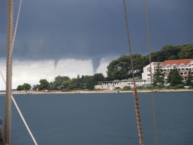 Zuerst haben wir Gischtwolken am Wasser gesehen und erst später hat sich dann der Nippel aus der Wolke ausgebildet. Da ich kein Radar habe, konnte ich die Zuggeschwindigkeit und Richtung nicht exakt ermitteln. Eine alte Faustregel besagt jedoch, dass sich Wasserhosen mit der Hauptwindrichtung bewegen, in unserem Fall also Richtung NNO, hat dann auch so gestimmt, das Ding ist Richtig Piran gegangen, hat sich aber rechtzeitig vor dem Land wieder aufgelöst. Ich war da nachträglich noch so richtig froh nicht in Piran geblieben zu sein, wenn einem sowas im Hafen drüberfährt, möcht ich nicht dabei sein! Auf See kommt man im rechten Winkel zur Zugrichtung eigentlich immer davon. Hab' noch ein Bild von der Wassergischt angehängt, die wir als erstes gesehen haben. Es kann natürlich auch sein, dass man aufgrund der Nähe in den Wolken anfänglich nichts gesehen hat.