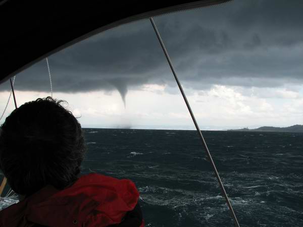 Zuerst haben wir Gischtwolken am Wasser gesehen und erst später hat sich dann der Nippel aus der Wolke ausgebildet. Da ich kein Radar habe, konnte ich die Zuggeschwindigkeit und Richtung nicht exakt ermitteln. Eine alte Faustregel besagt jedoch, dass sich Wasserhosen mit der Hauptwindrichtung bewegen, in unserem Fall also Richtung NNO, hat dann auch so gestimmt, das Ding ist Richtig Piran gegangen, hat sich aber rechtzeitig vor dem Land wieder aufgelöst. Ich war da nachträglich noch so richtig froh nicht in Piran geblieben zu sein, wenn einem sowas im Hafen drüberfährt, möcht ich nicht dabei sein! Auf See kommt man im rechten Winkel zur Zugrichtung eigentlich immer davon. Hab' noch ein Bild von der Wassergischt angehängt, die wir als erstes gesehen haben. Es kann natürlich auch sein, dass man aufgrund der Nähe in den Wolken anfänglich nichts gesehen hat.