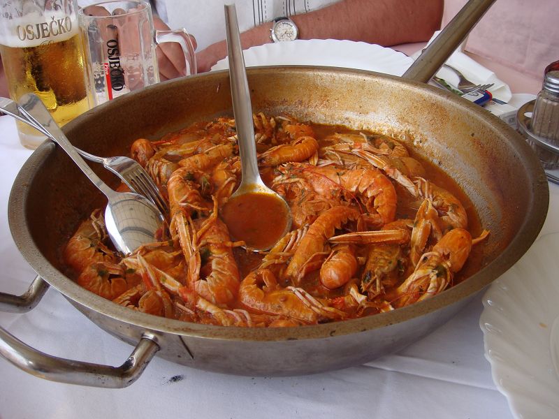 Fisch und andere Meeresfrüchte in verschiedensten Varianten (z.B. Scampi Buzara-Art