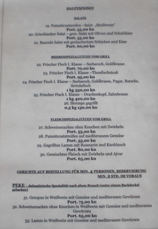 Speisekarte von Solta(Bucht Sesula). Preise und Qualität waren in Ordnung und die Boje war Gratis.