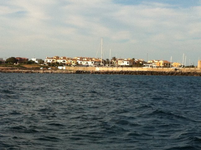 Antioco zurückzulaufen. Wind kommt jetzt genau aus O, also Rückenwind, verlassen die Bucht, Motor läuft auf Standgas,