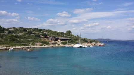 Am Freitag bin ich dann in Zlarin "festgesessen" und hatte tagsüber keine Chance aus dem Hafen zu kommen, weil ich die Kurve um Nachbar's Mooring nicht bekommen hätte, ohne, dass mich die Bora ins Seichte verweht hätte. (bin ganz hinten im Eck gelegen, wo das kleine Becken mit dem Kran ist - siehe Foto)